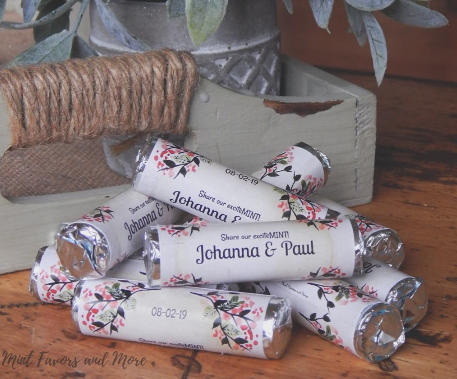 See more designsDelicious mint rolls wrapped with a personalized label to match your wedding or event. These mints can be displayed at weddings or parties, used in welcome bags or set in a bathroom basket. You will receive a digital image for approval prior to assembly.